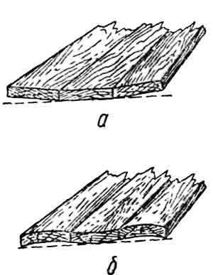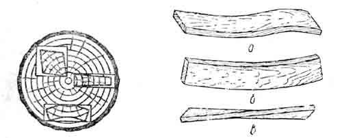 Коробление древесины — одно из отрицательных ее свойств. Однако его можно уменьшить или даже воь.:е устранить. Например, чтобы собранный из досок щит не покоробило, необходимо при сборке его располагать доски годичными слоями в разные стороны (рис. 3). Если же щит собрать на шпонках или в наконечник, то после усушки доски вообще коробиться не будут. Растрескивание является результатом неравномерного высыхания наружных и внутренних слоев древесины (рис. 4). Трещины образуются сначала в торцах, а затем вдоль бревна или доски. При умелой сушке лесных материалов можно уменьшить растрескивание или вовсе ликвидировать его.