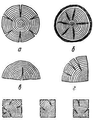 Образованию трещин способствуют имеющиеся в древесине сердцевинные лучи, особенно у пород, у которых они хорошо развиты (дуб, бук). Окоренные бревна растрескиваются сильнее, чем неокоренные.